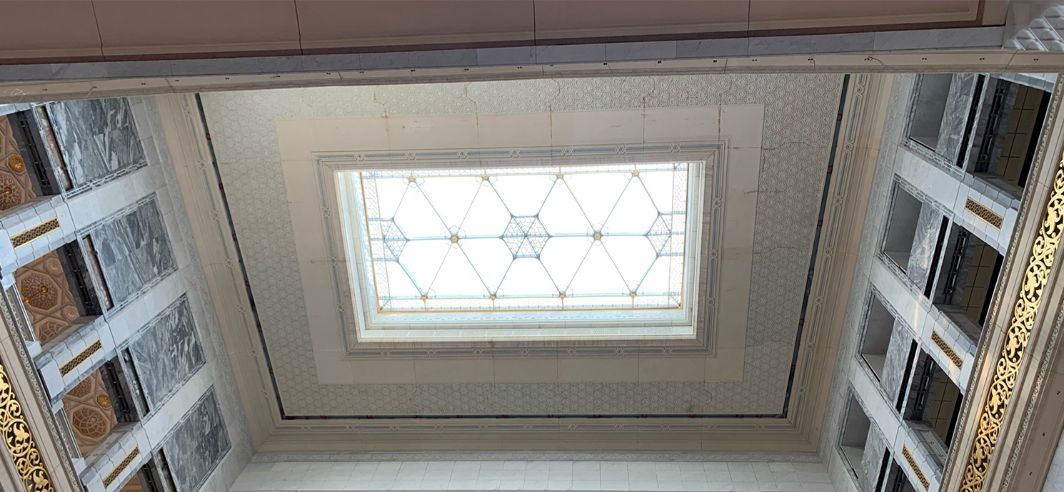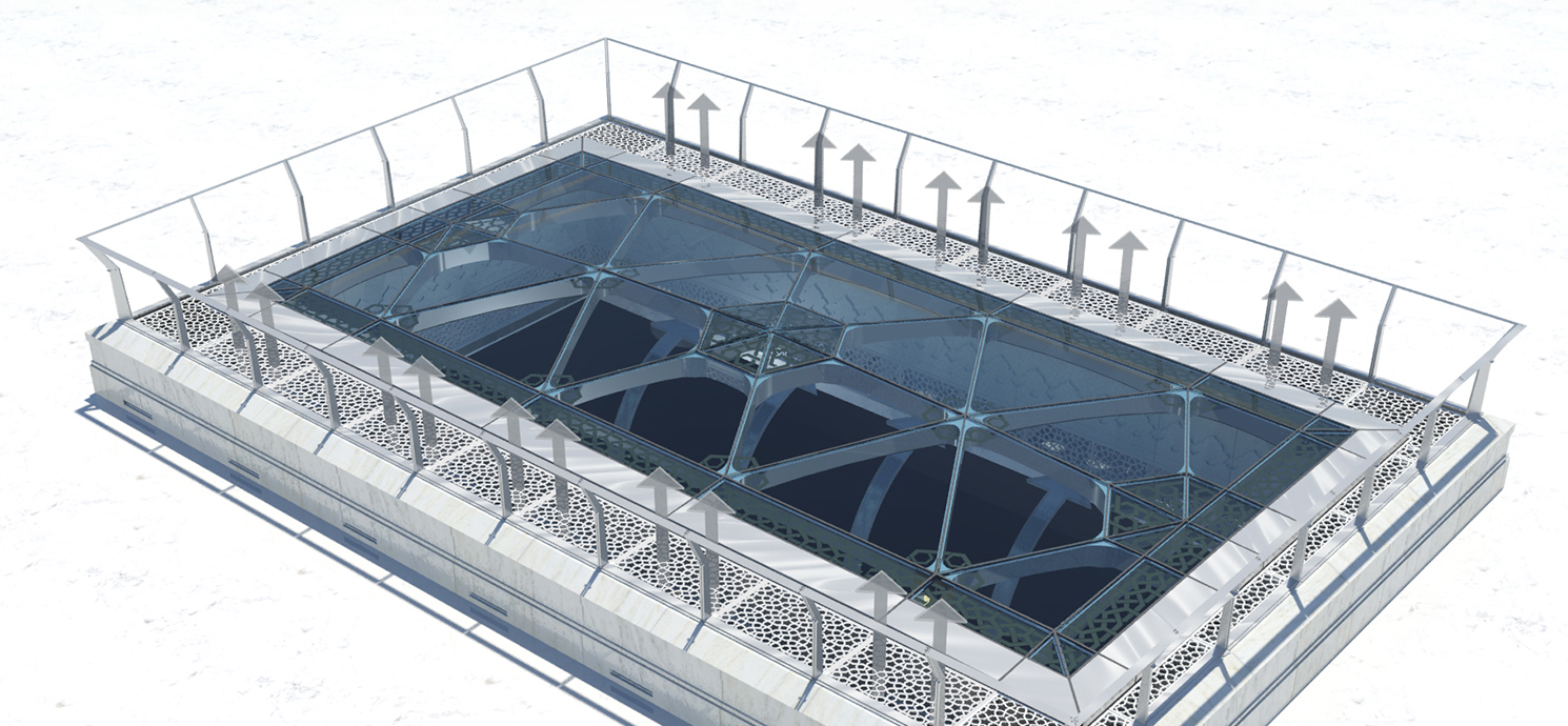 Im Zwischengeschoss des Haram Expansion Buildings sind die „Lower Skylights“ installiert, die Tageslicht in die Innenhöfe lassen und über ein integriertes, ferngesteuertes Belüftungssystem verfügen, das bei Bedarf Rauch und Hitze effektiv abführt.