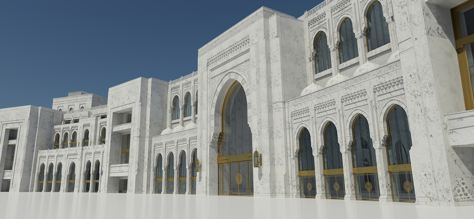 Die individuell gestalteten Tore des Haram Expansion Buildings sind aus hochwertigem Edelstahl gefertigt und enthalten präzise elektromechanische Komponenten. Mit 400-V-Motoren, Frequenzumrichtern und einem motorisierten Verriegelungssystem sorgen sie für eine reibungslose und sichere Bedienung.