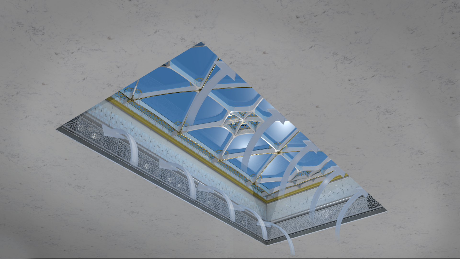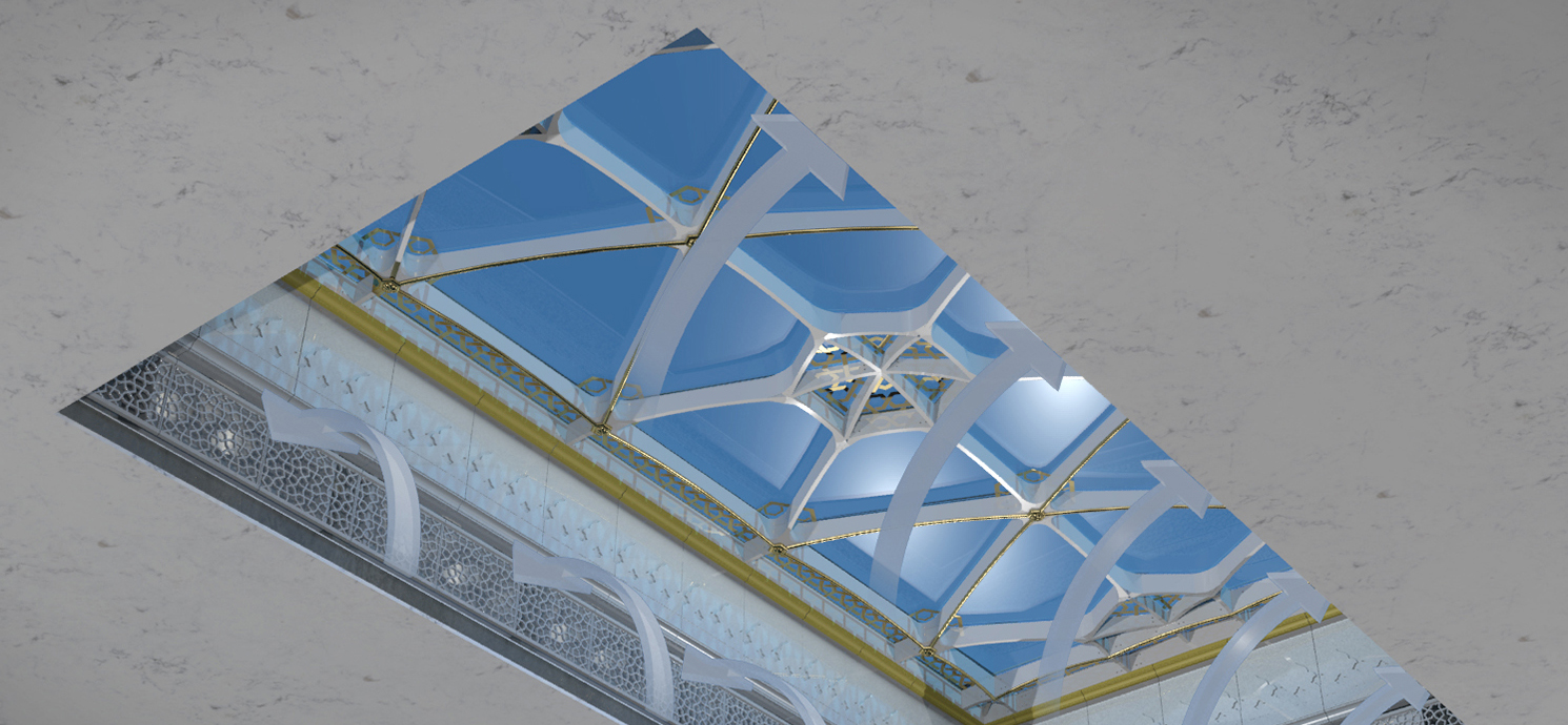 Im Zwischengeschoss des Haram Expansion Buildings sind sechs sogenannte „Lower Skylights“ installiert. Dabei handelt es sich um rechteckige Dachstrukturen mit dekorativen Elementen. Die feststehende Konstruktion hat ein Mehrventilator-Lüftungssystem integriert. Die Skylights bestehen aus transparentem Glas, das Tageslicht in die Innenhöfe des Gebäudes lässt, und verfügen über ein integriertes Belüftungssystem.Die Lüftungsanlage besteht aus mehreren, sowohl innen als auch außen unsichtbaren Ventilatoren, da die Ein- und Auslässe durch Zierplatten abgedeckt sind. Das ferngesteuerte Belüftungssystem reguliert Temperatur und Luftfeuchtigkeit im Gebäude. Um Rauch und Hitze im Brandfall schnellstmöglich aus dem Gebäude abzuführen, schaltet sich das System mit maximaler Leistung ein.