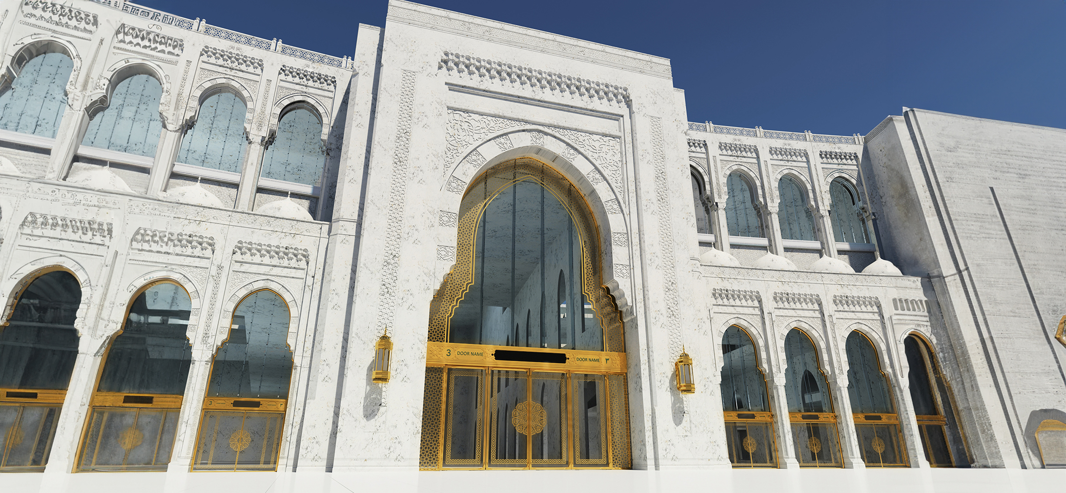 Die Tore sind in ihrer Abmessung und Design individuell auf die Architektur und die umgebende Fassade abgestimmt. Die Tragkonstruktion und Torrahmen bestehen aus hochwertigem Edelstahl. Oberhalb des Torrahmens befindet sich ein Querträger mit allen elektromechanischen Komponenten, welche die beiden Flügel antreiben. Der Querträger beherbergt außerdem die Kalligraphieantriebseinheiten und das Verriegelungssystem und wird von den Kalligraphieplatten abgedeckt.